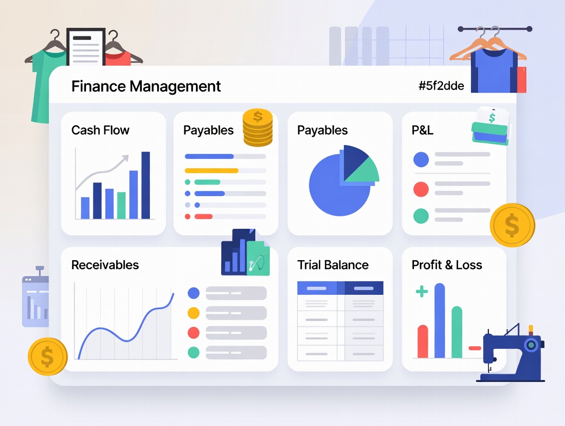 Managing finances in apparel manufacturing includes cash flow, supplier payments, payroll, and customer receivables. Separate accounting systems often create errors and reporting delays.