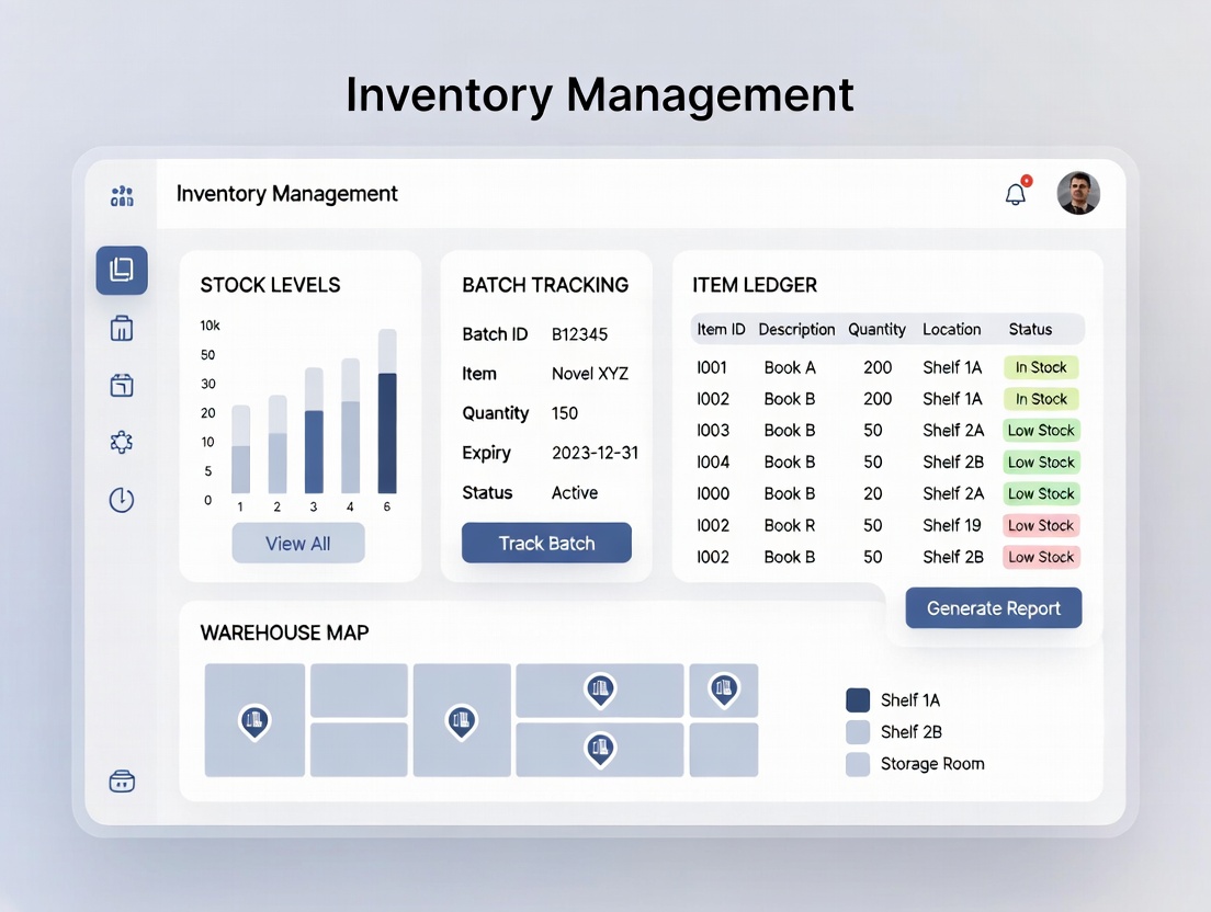 The Inventory Management module provides real-time stock visibility, automated stock control, and accurate warehouse tracking. It minimizes stock shortages and overstocking through intelligent monitoring and reporting tools. This ensures smooth operations, reduced losses, and improved inventory accuracy.