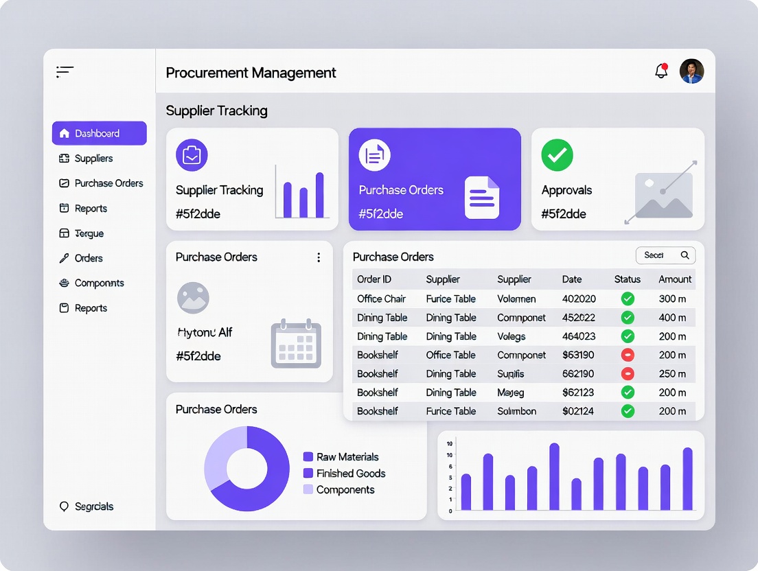 Furniture manufacturers source multiple raw materials like wood, laminates, veneers, hardware, fabrics, and finishing products from various suppliers. Manual procurement often causes stock shortages, overstocking, or delays in production.