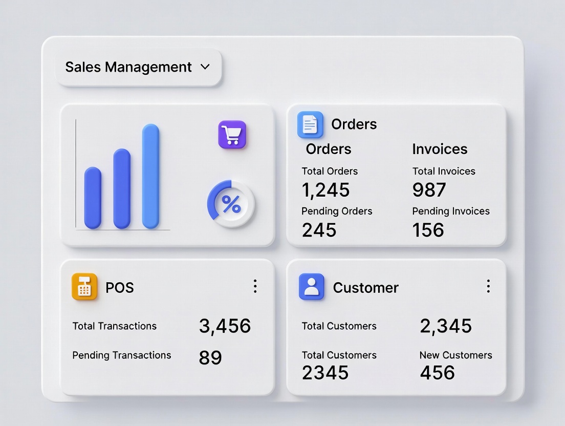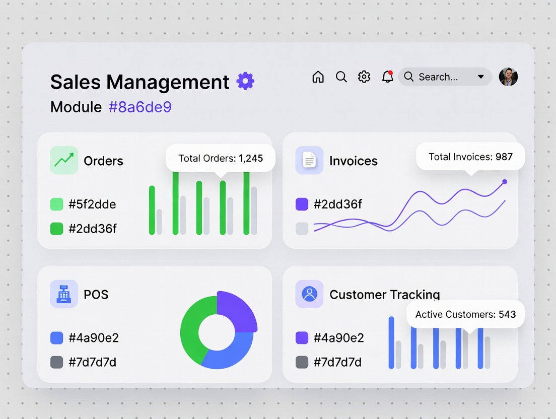 High-value products require efficient billing, customer tracking, and order management. Slow billing and poor tracking can affect customer experience and sales performance. This module handles customer registration, quotations, sales orders, invoices, POS billing, and returns. Sales performance tracking helps managers monitor revenue, seasonal trends, and staff efficiency.