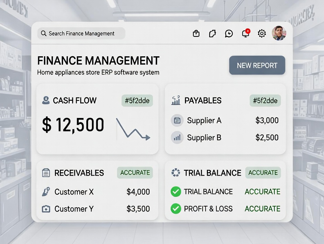Managing high-value appliances requires precise accounting for cash flow, supplier payments, expenses, and customer credits. Separate accounting systems often cause delays and discrepancies. This module integrates accounting directly into operations, providing instant financial statements, trial balance, profit & loss, balance sheet, and customer/supplier aging reports. This ensures accurate financial tracking and easier decision-making.