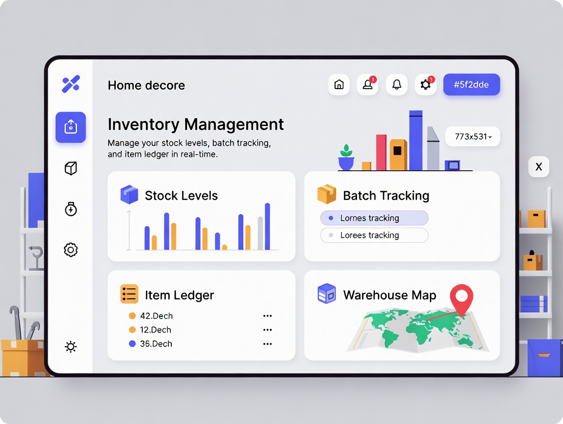 Home décor products vary in size, color, style, and collection. Without proper tracking, stores often face stock mismatches, slow-moving items, and losses due to mismanaged inventory. This module manages detailed product charts, opening stock, stock adjustments, transfers between branches, and bundle or kit creation for seasonal collections. Real-time monitoring and alerts ensure that best-selling items and trending collections are always available.
