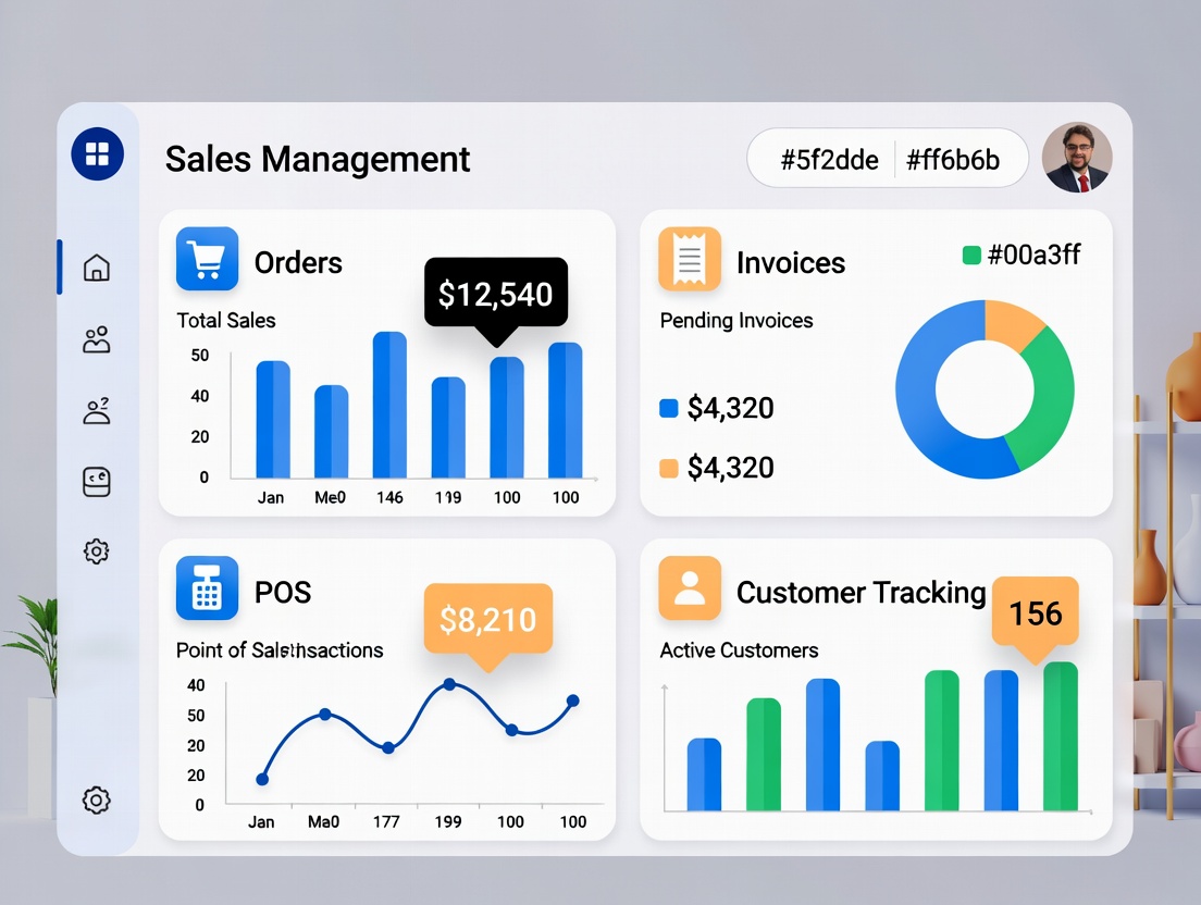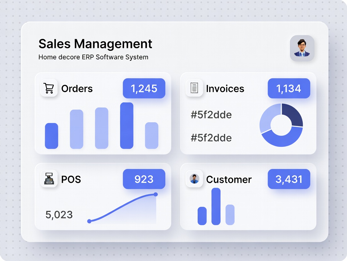 High-value and seasonal décor items require efficient billing, customer tracking, and order management. Slow processes can impact customer satisfaction and reduce sales. This module handles customer registration, quotations, sales orders, invoices, POS billing, and returns efficiently. Managers can track sales performance, monitor seasonal trends, and evaluate staff efficiency.