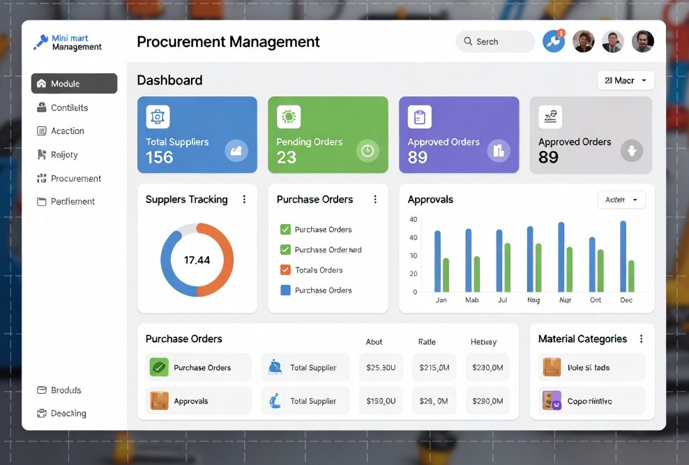 Mini marts deal with multiple suppliers, daily essentials, seasonal products, and fast-moving items. Manual procurement often leads to overstocking, stockouts, and delayed deliveries. This module organizes supplier data, purchase orders, invoices, and returns efficiently. It also tracks pending orders, monitors supplier payments, and helps plan inventory based on demand trends.